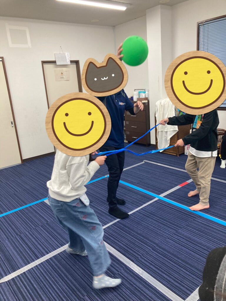 お友だちとペアになり、両手にビニールテープをもち、風船を隣のお友だちにパスしていくという内容です。