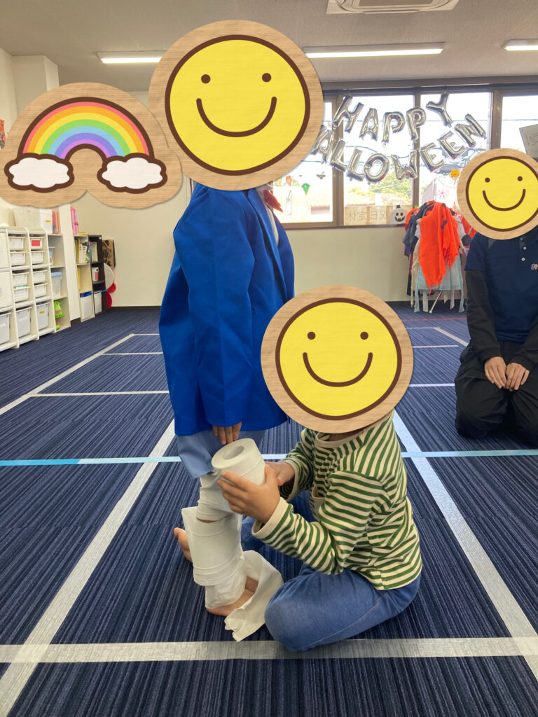 ミイラ役のお友だちはトイレットペーパーを上手に負けるように、両手を脇にあてジッと立ってくれていました✨