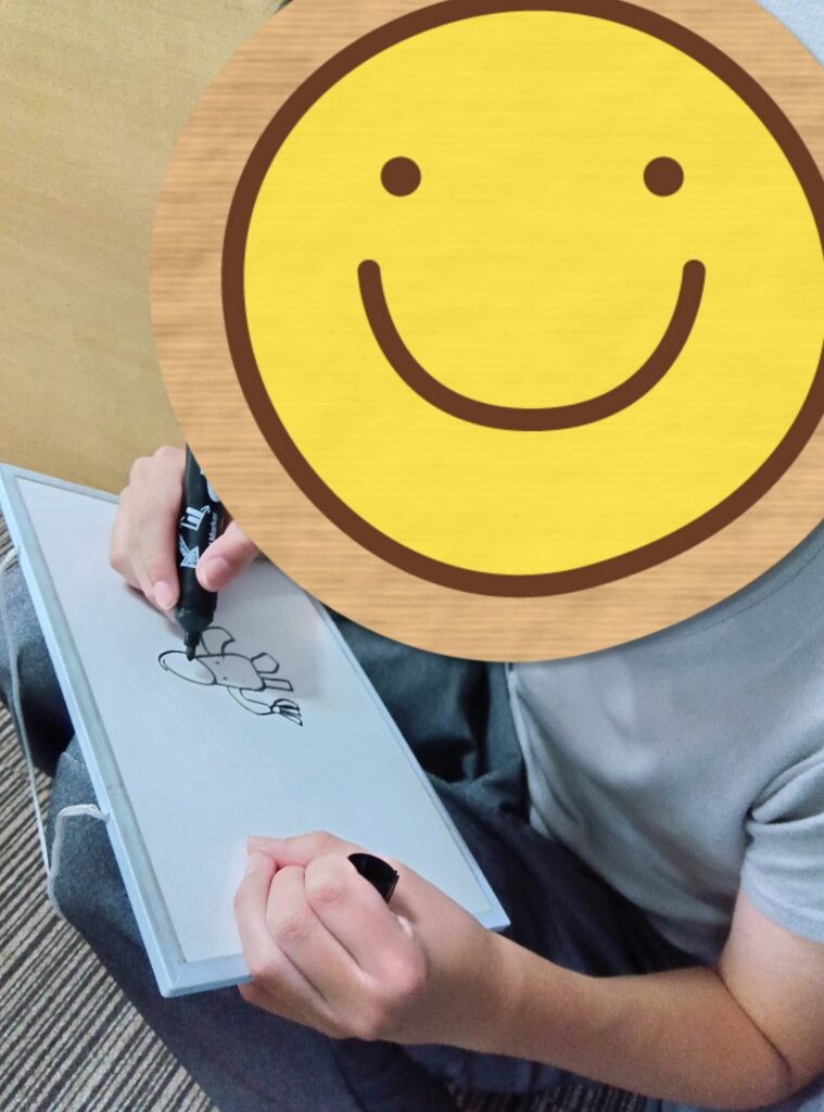 色々な伝え方を経て最後尾のお友だちまで届いたお題を、絵に描いてスタッフに伝えてもらいます。