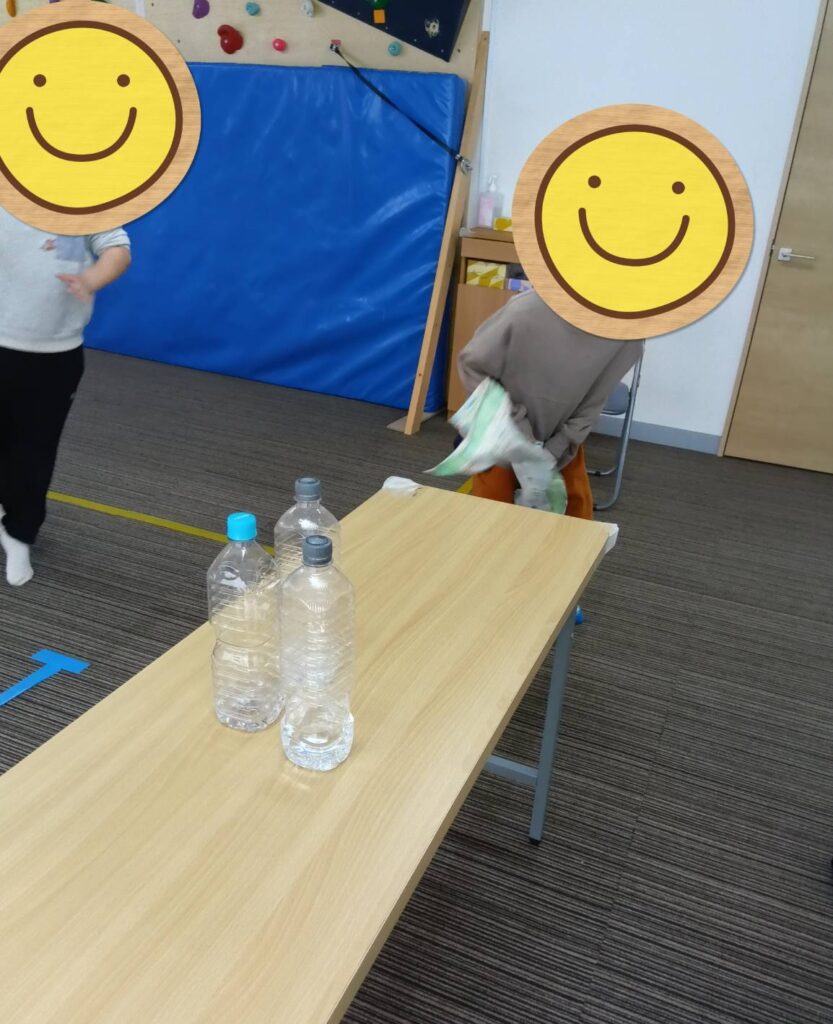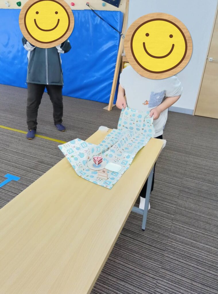長テーブルにテーブルより少し小さい布をテーブルクロスとして敷き、その上に水の入ったペットボトルやおもちゃの皿🍽️やケーキ🍰などを置いて、テーブルクロスを引き抜くという内容で行ないました。