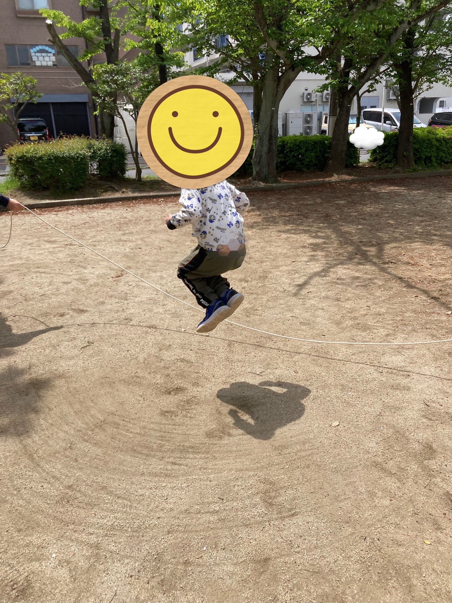 公園では、いつもの公園活動のように遊具や砂場で遊びたくなる気持ちを抑えて、大縄の近くに一列で並んでいきます。