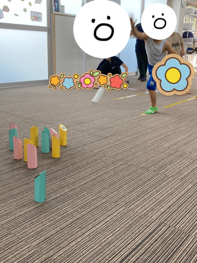 『モルック』は段ボール製の物を使用して行いました。通常の木製と比べて軽いため、パワーよりもコントロールが重要になります。