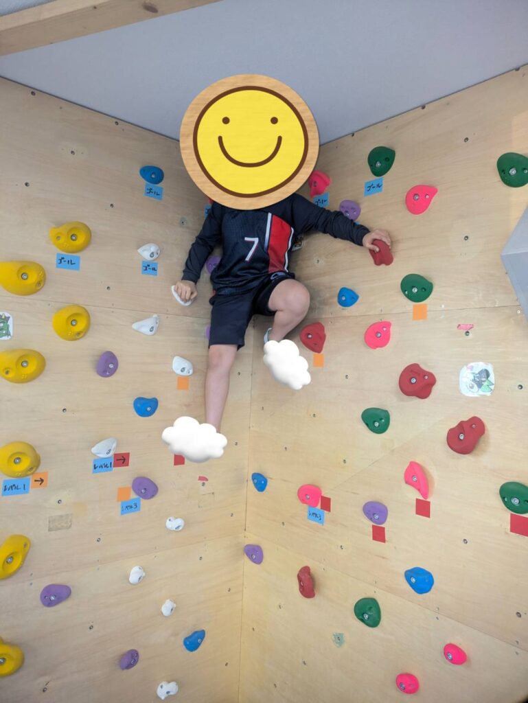 写真のお友だちは、この左の壁の課題を全てクリアすることができため、一番高い位置から他のお友だちの様子を見守っているところです👀。