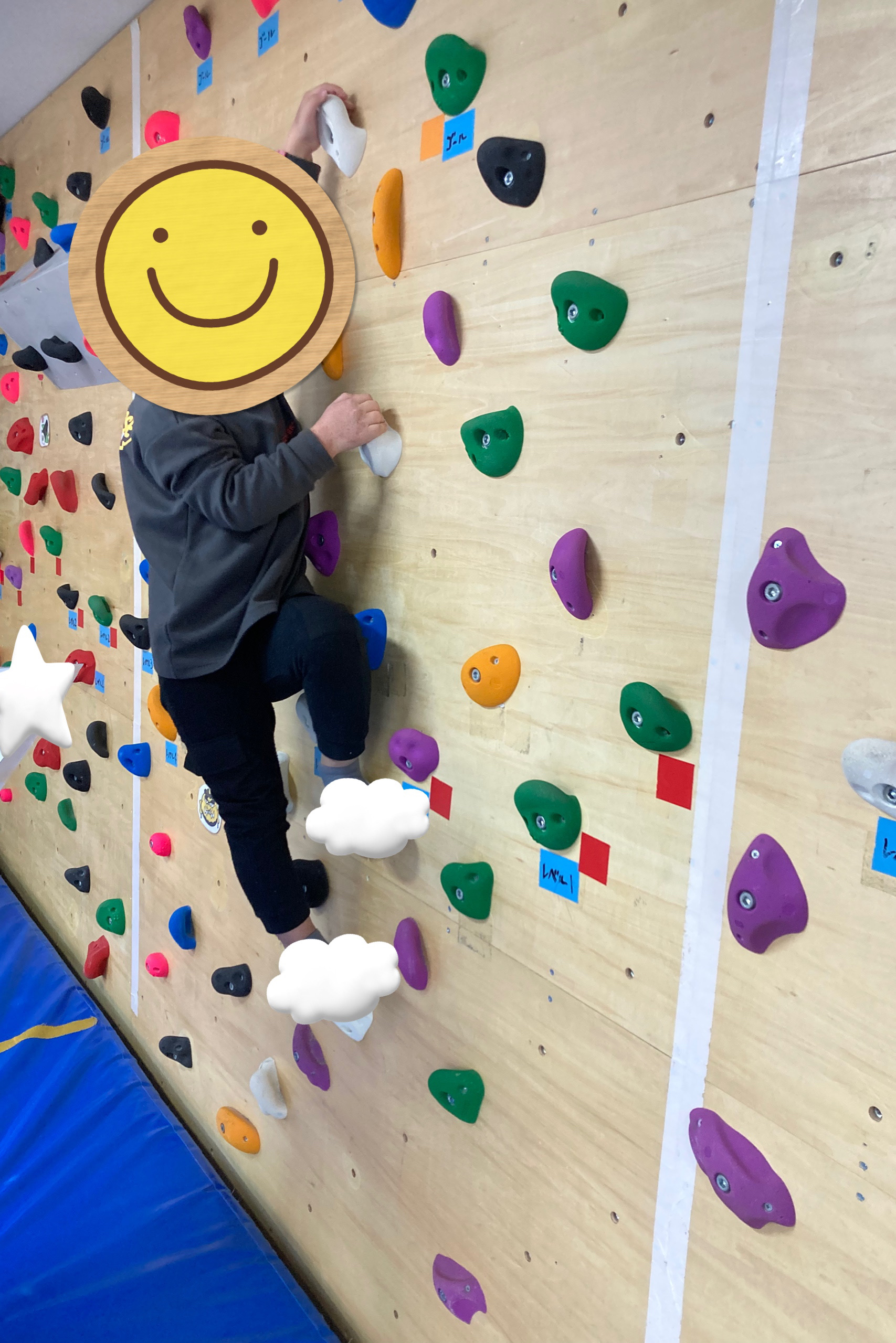 写真のお友だちは、この左の壁の課題を全てクリアすることができため、一番高い位置から他のお友だちの様子を見守っているところです👀。