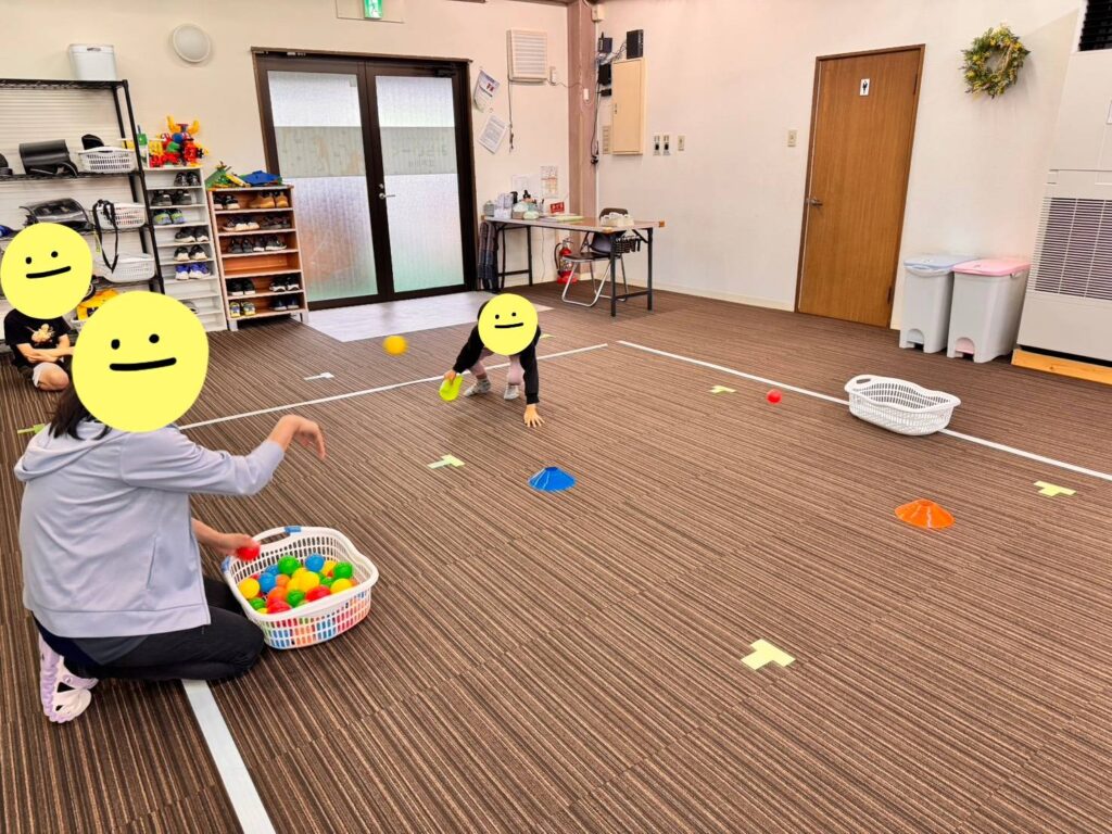 カラーコーンひろいは、床に落ちているカラーコーンを、スタッフが投げるカラーボールに当たらないように動きながら拾っていく内容で行いました。
