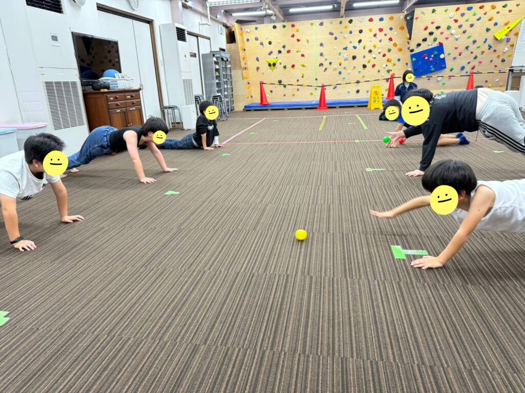 腕立て伏せの格好を維持することも大変そうでしたが、転がってくるボールを片手で止めることに児童たちは「難しい!」と苦戦していました💦