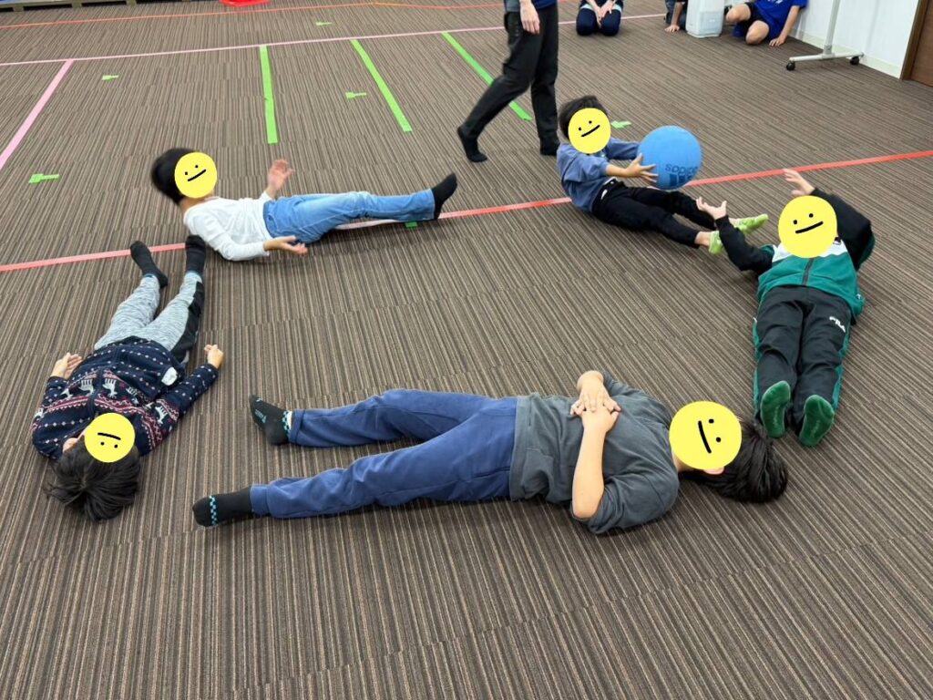 まずは、寝転んだ状態で上半身を起こしてボールを渡していく、ボール渡しリレーを行いました✨
