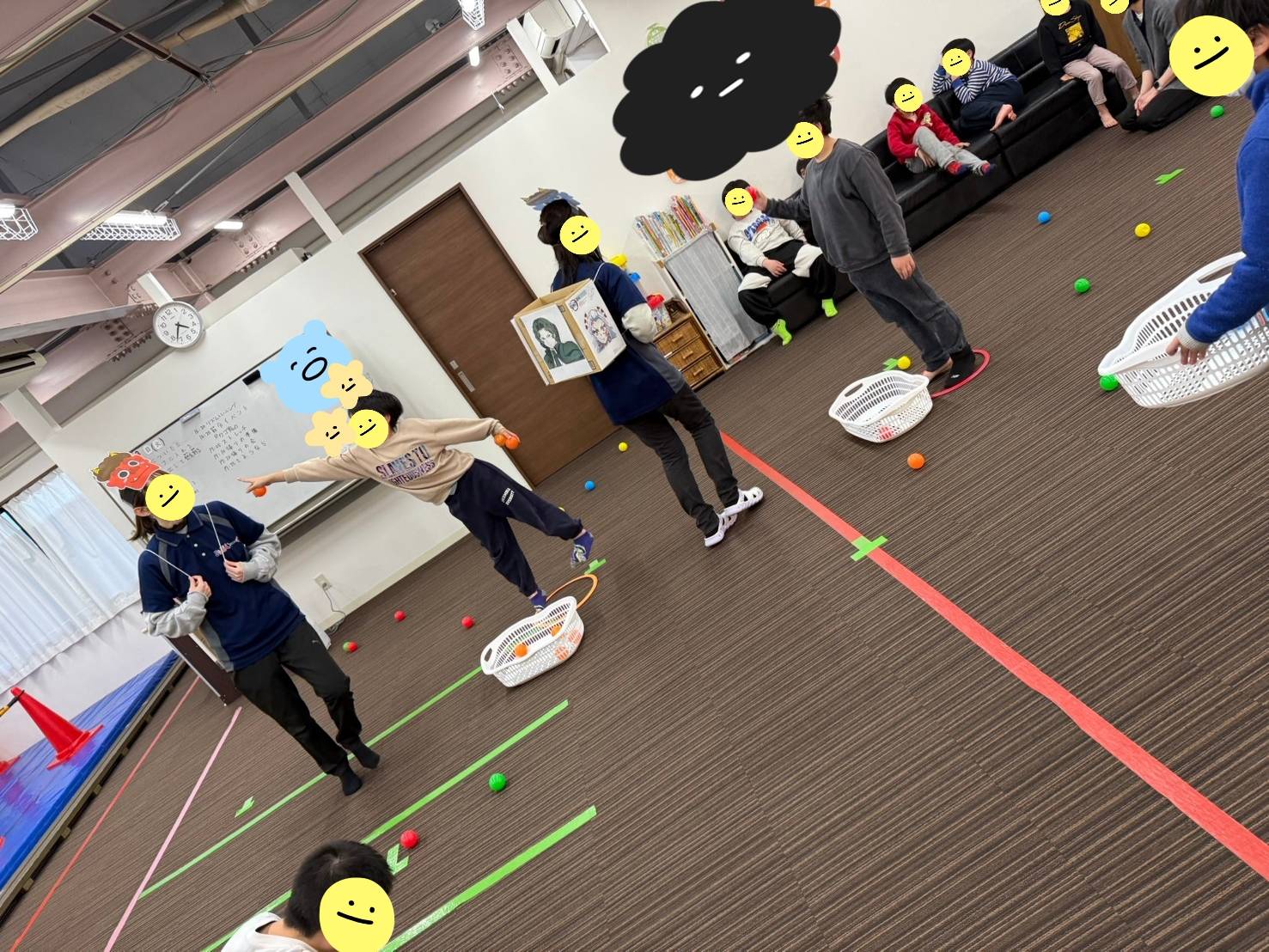 カゴ鬼は、鬼の背負ったカゴに、豆――の代わりのカラーボールを投げて入れていく内容で行いました✨
