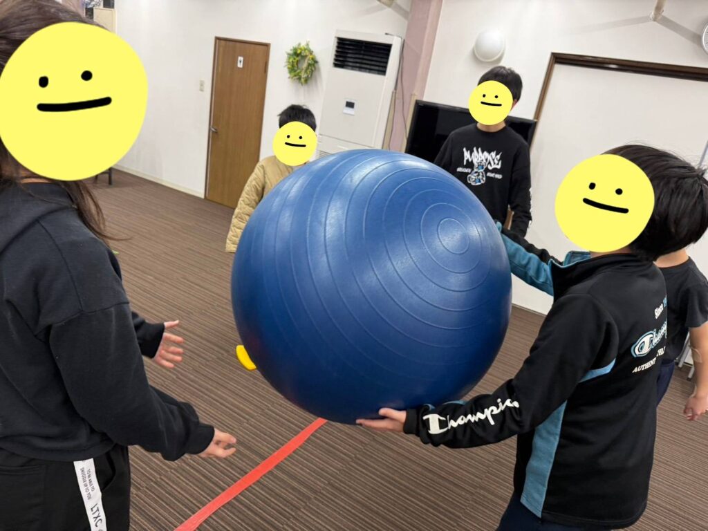 音楽が鳴っている間、緩急をつけて児童たちはバランスボールを渡していました✨