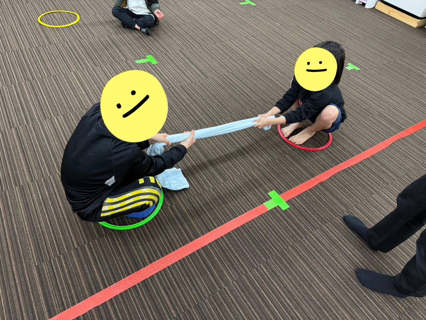 しゃがみながらの為、バランスがとりにくいですが、児童たちはバランスを取りながらタオルを引っ張っていました💦