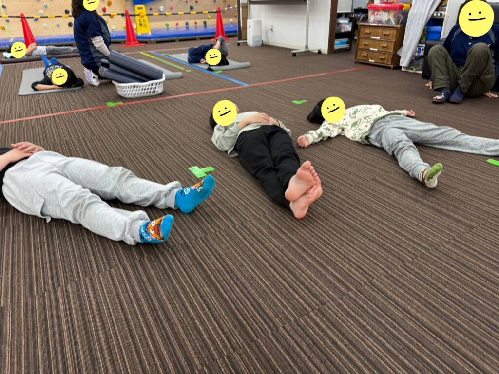 おやすみのポーズとして、寝転んだ状態で鼻呼吸を1分間していきます。リラックスして、1分間と短い時間でしたが、「眠くなっちゃった~」という児童もいました😊