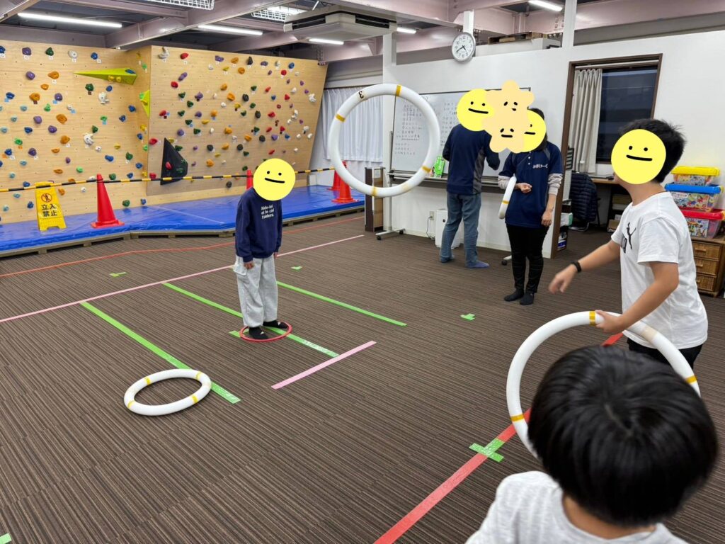 スポンジでできたやわらかい輪っかを、友だちの指定したところに投げる内容です。投げる役と、キャッチする役に分かれて行いました✨