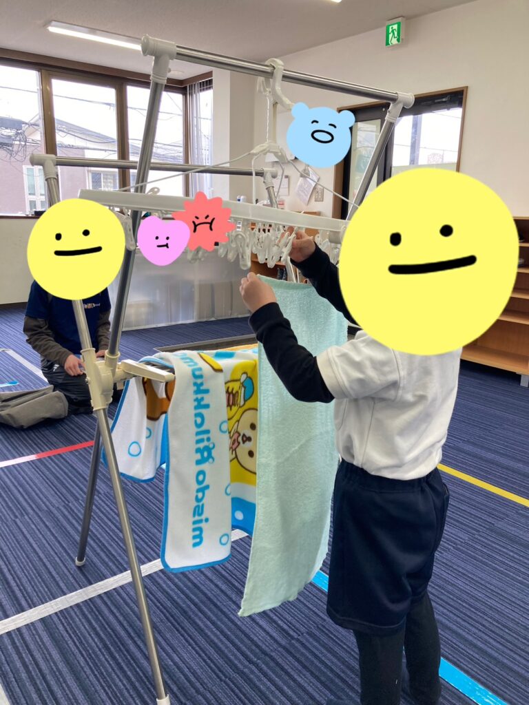 お洗濯で洗濯ばさみにタオルを挟んだり、新聞紙を雑巾に見立てて雑巾がけをしたりと指先も身体もたくさん使ってもらいましたが、どちらも丁寧に行うことが出来ていました✨